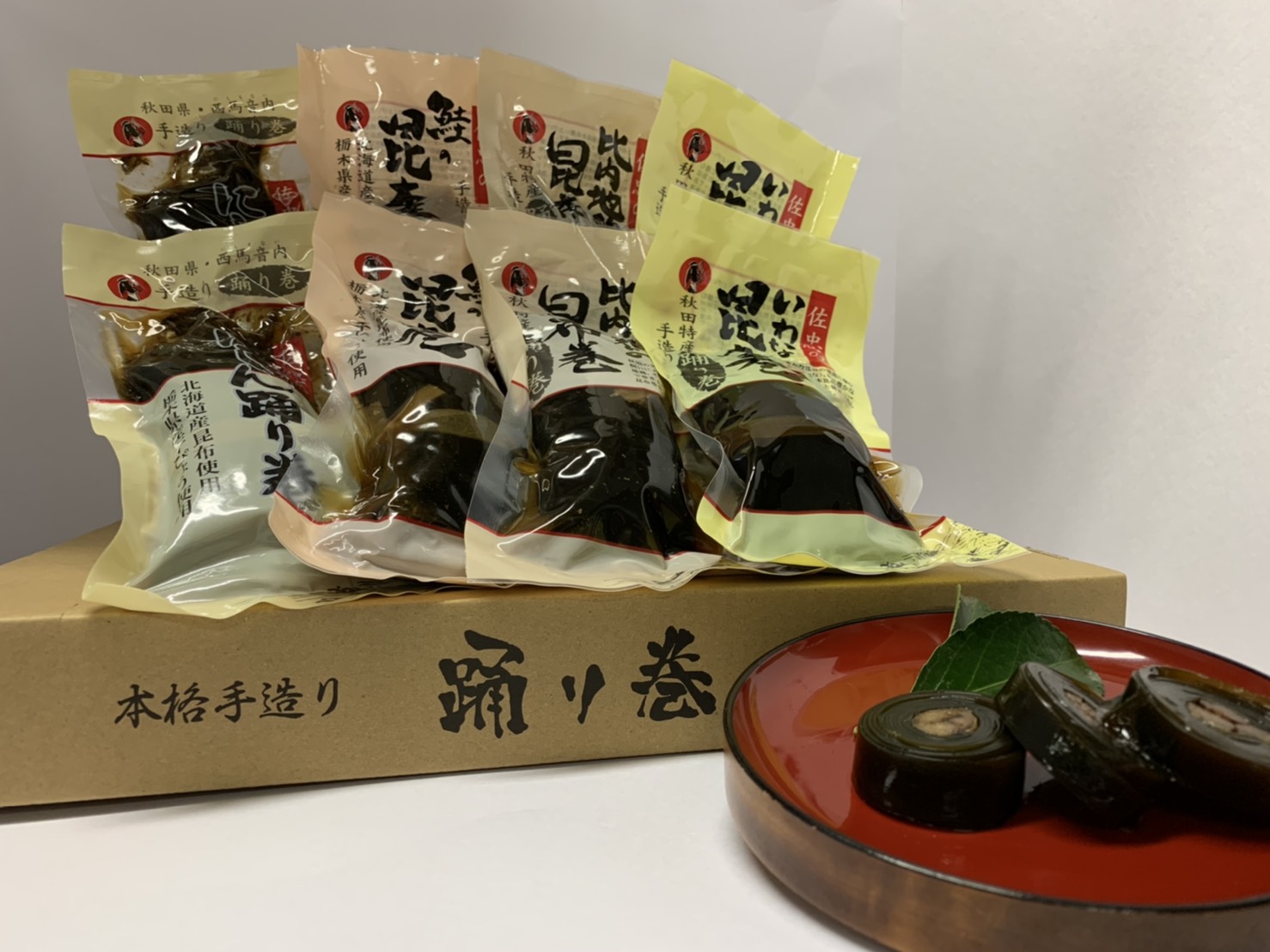 厳選したニシンやイワナ、鮭、比内地鶏な どを北海道産昆布で一本ずつ丁寧に巻きあげています。 昔ながらの製法と秘伝のタレでじっくり煮込んだ柔らかい昆布と具材の旨みをご賞味ください。